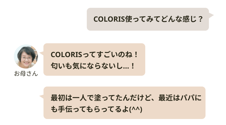 COLORISの手軽さと品質にすっかりハマってしまい、今ではヘアカラーのメンテナンスはCOLORIS、親子参観や結婚式の前日はサロンと使い分けてヘアケアしています!